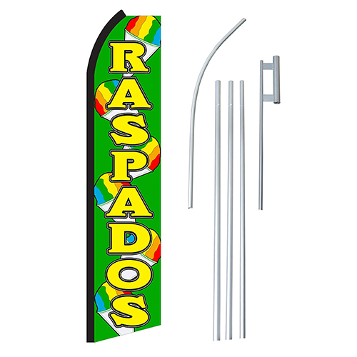 1-800-Shaved-Ice carries three different designs. Each flag is nearly 2.5' wide and 12' tall, with a 15' foot aluminum pole, which breaks down into four pieces for easy travel and storage. Once assembled together these shaved ice flags fly high - over 15 feet! Each shaved ice feather flag includes a heavy-duty aluminum spike to be used if needed. Simply use a hammer to press the spike into the ground [grass or dirt].