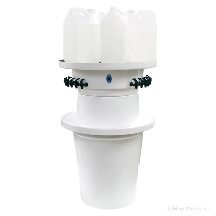 The top unit supports six 2.5-gallon jugs to store flavors. Each jug has separate valves to control the flow of syrup.