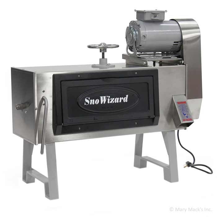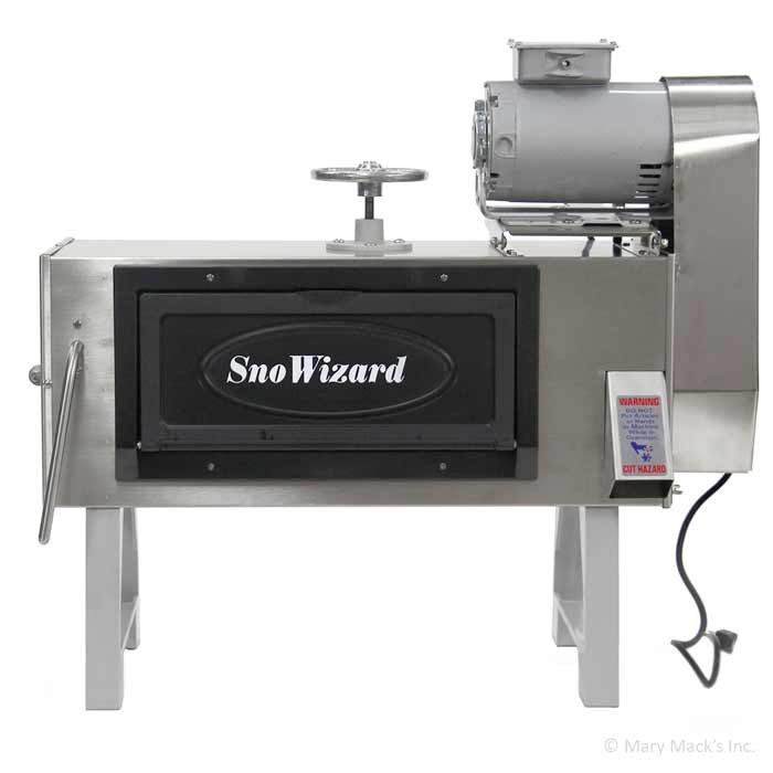 The New Orleans Block Shaved Ice Machine is made by SnoWizard and is the original snowball maker of this style. It weighs 100 pounds and includes an impressive lifetime warranty on the machine and (an unheard of) 5-year warranty on the motor. This machine will truly last a lifetime. Its remarkable stainless construction with a polycarbonate door has been perfected since 1936. It has patented legs to provide a wide stance which decreases vibration while allowing ice overspray to drip freely to the pan. This New Orleans snowball machine is incredibly quiet and is used by shaved ice vendors worldwide.
