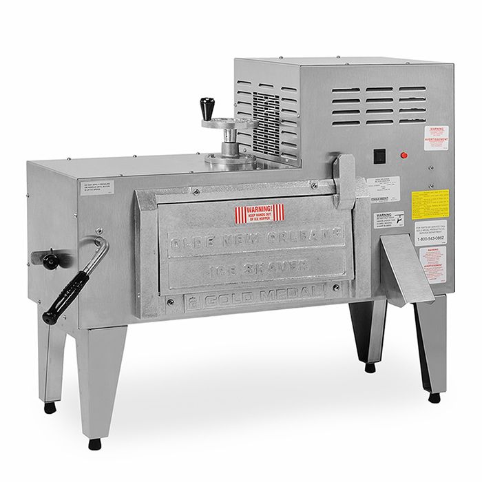 To operate the "Olde New Orleans" Block Ice Shaver, put a 6 to 12 lb block of clear ice into the ice block compartment. The front door has a "safety switch" to protect the operator until the cast aluminum door is safely locked in the closed position. The heavy-duty lever on the left-hand side allows the operator to apply pressure. The more pressure, the coarser the ice - light pressure provides a finer snow.
