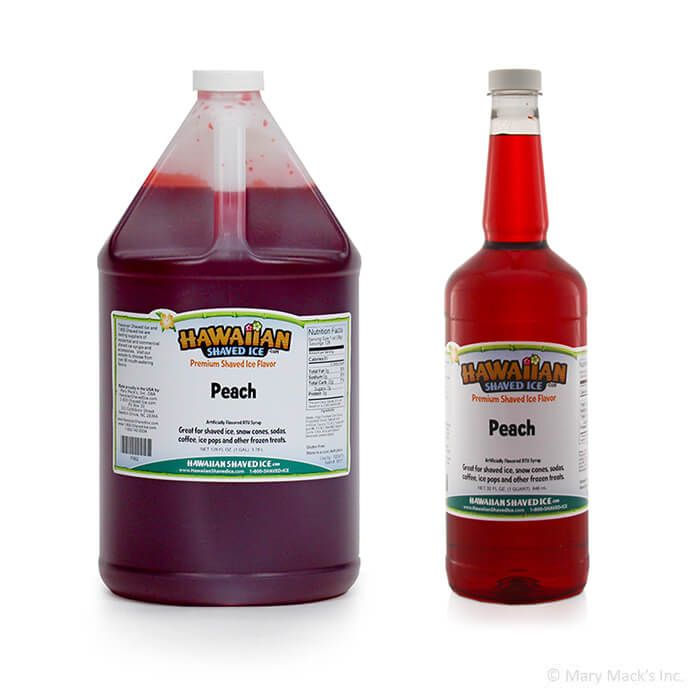 Peach shaved ice is ready-to-use. This same syrup for snow cones is sold in both quarts and gallon jugs, or if you prefer to mix your own, you can order it in concentrate, too!