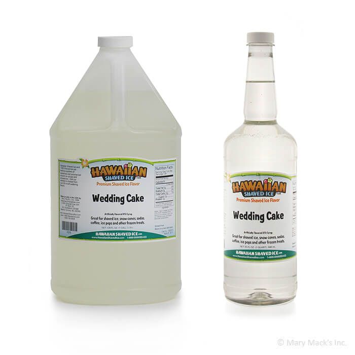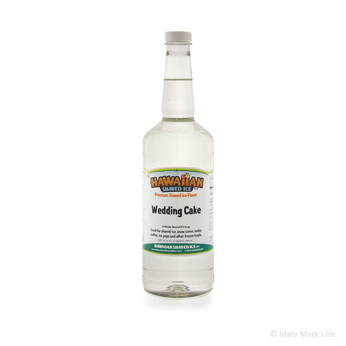 This Hawaiian Shaved Ice flavoring is ready-to-use, available in both quarts and gallons. You will probably need a gallon once word gets around that you have it. This is sure to be a favorite of kids and adults alike, and parents of young children will love that it is clear, so there are no colorful stains left behind. Wedding Cake syrup for snowballs is also available in concentrate.